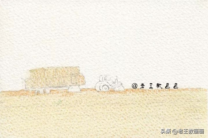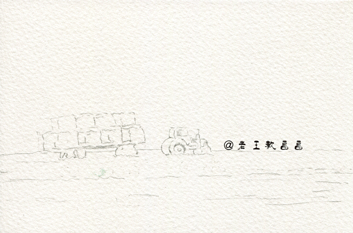 >>>【第1步】:画面分为3部分,地面、天空和主体物。根据原图,用2B铅笔画出天空和地面的区域,画出拖拉机的外轮廓(P1↓)