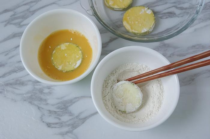 接下来,将打散的鸡蛋液准备好,将腌制过的西葫芦片先裹上面粉,再沾上蛋液,这样一来,西葫芦片会裹上一层薄薄的面粉和鸡蛋液,为煎饼的口感带来更多层次的丰富。