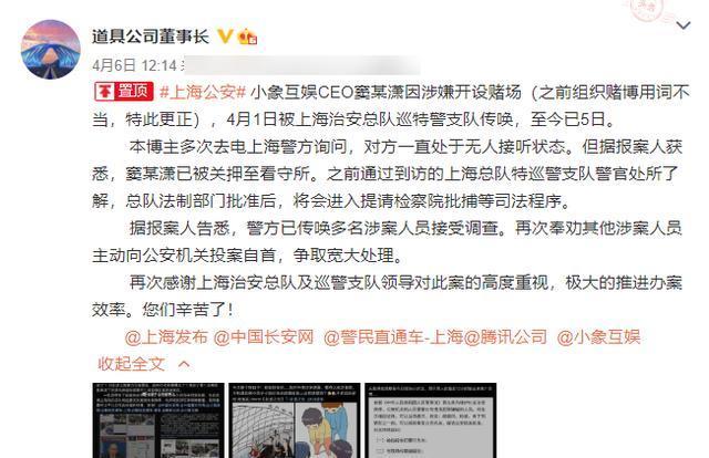 为此PDD专门直播辟谣过两次,并且放出话,只要有人找出他参与假赛的证据,自己无条件退圈;虽然LDL假赛一事闹得很大,但确实也没人爆料PDD参与过假赛。事情过了一段时间,假赛风波渐渐过去,然而最近PDD又被人提起,这下他恐怕又得出来辟谣了。知情人爆料:小象互娱CEO涉赌被抓如图所示,这个博主爆料小象互娱CEO窦雨潇涉嫌开设赌场被抓,为什么这事又跟PDD扯上关系呢?因为PDD也是小象互娱的四大股东之一,而在2月底,这个博主就在放出PDD玩扑克的照片,看起来似乎在赌博,加上现在CEO被抓,显得PDD跟这件事也有很大关系。