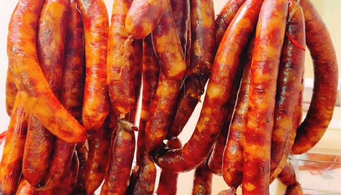 2、晾挂保存:我们首先将香肠放在阴凉通风处将它彻底风干了,随后将它直接晾挂在阴凉干燥处,但是要避免阳光直射。等到气温逐渐上升之后就要检查香肠是否保持着干燥。因为香肠一旦表面出现油渍的时候,就表面气温过高,这时必需将它放入冰箱中。