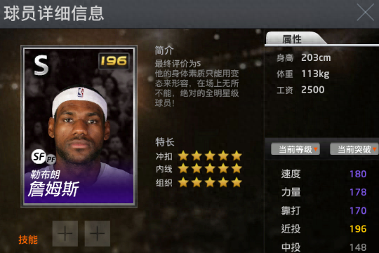 詹姆斯作为现实NBA的第一人,在游戏里也是强大的很,詹姆斯的强大在于他的全面,无论是突破还是投篮,无论是防守还是篮板,他都是游戏里最顶尖的球星。