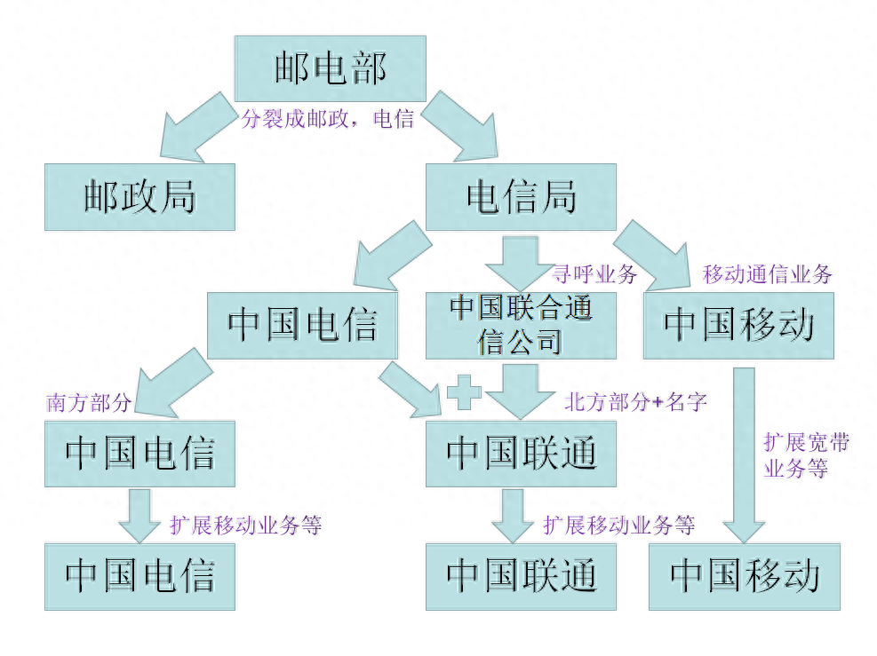 现在移动电信联通三家为了竞争,商业上打的难解难分。但如果追寻历史的话,就会发现,其实原来是一家分出来的。为了方便理解,我画了一张草图。