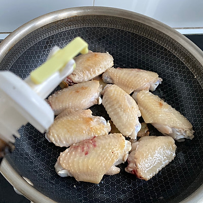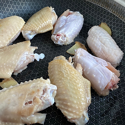 1、将鸡翅洗净,用牙签戳戳。放在不粘锅里用文火慢煎。放入姜片。