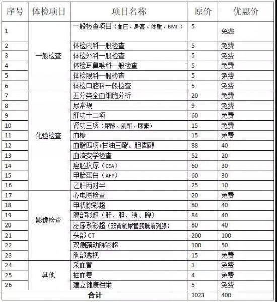 针对老年人不同的体检需求,确定了三种体检套餐供老年人选择(见下表附件)。对心电图等16个项目进行免费检查,对CT等10个项目按半价收费。对需要检查的体检套餐外的检查项目同样执行半价收费标准。