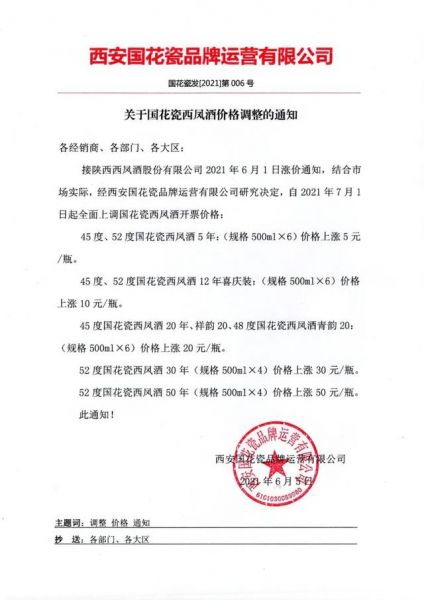 日前,从西安国花瓷品牌运营有限公司得到消息,国花瓷西凤酒发布调价通知,通知显示:接陕西西凤酒股份有限公司2021年6月1日涨价通知,结合市场实际,经西安国花瓷品牌运营有限公司研究决定,自2021年7月1日起全面上调国花瓷西凤酒开票价格: