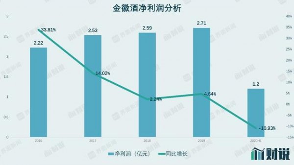 自上市以来,金徽酒年度净利润一直保持在2.2亿元至2.7亿元之间,在其他酒企纷纷突围之际,金徽酒停滞不前。同期,同为区域酒代表的今世缘(603369.SH)净利润已由7.54亿元增长至14.58亿元,增幅高达93.37%;口子窖由7.83亿元增长至17.2亿元,增幅为119.67%。