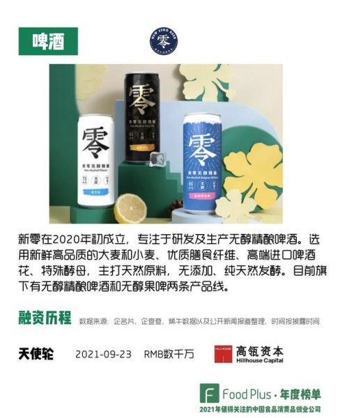 正是看到全球无醇酒精的消费趋势及国内市场品牌的相对空白,新零无醇啤酒于2020年成立。新零目前有两大产品线,一类是精酿系列,一类是果啤系列,配料里没有添加香精,并额外添加了膳食纤维,同时还在热量上做了控制。总体来说,新零的核心优势主要在于供应链管控与独创工艺两方面。一方面,在供应链上,与国外原材料供应商直接合作,产品原材料产地直采。源头上控制原材料品质控制成本。另一方面,在工艺上,对酿造设备及工艺细节调整,独创了一套清酿法,去除酒精和高热量,保证口感同时也使营养成分不被破坏。上线之后表现不错,得到了一定数量的消费者认可和复购。
