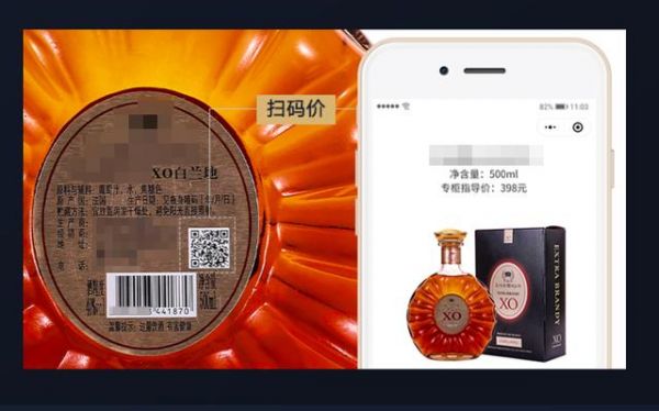另一款带有路易字眼的原瓶进口XO白兰地,在电商平台的售价为59元/瓶,详情页中直接写有“扫码价398元”的字样。