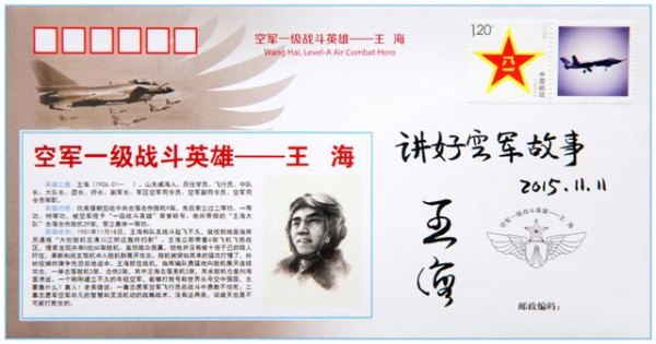 2020年春节,本想前往探望生病住院的王海老英雄,因为疫情原因未能如愿,我就请人制作一张空军“蓝天娃”致敬老英雄079号功勋战机的大照片,请其家人放到老英雄的病房,同时还有那张《空军一级战斗英雄——王海》纪念封,让老英雄在最后的那段时光可以触摸战斗岁月的印记。