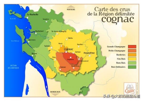 另外,法国干邑区有6个子产区,分别是大香槟区(Grand Champagne)、小香槟区(Petite Champagne)、边缘区(Borderies)、上乘林区(Fins Bois)、优质林区(Bons Bois)以及普通林区(Bois Ordinaires)。它们因土壤、气候等方面的不同,因而赋予了我们口感上的差异。一般认为,来自大香槟区和小香槟区的“生命之水”品质最优。