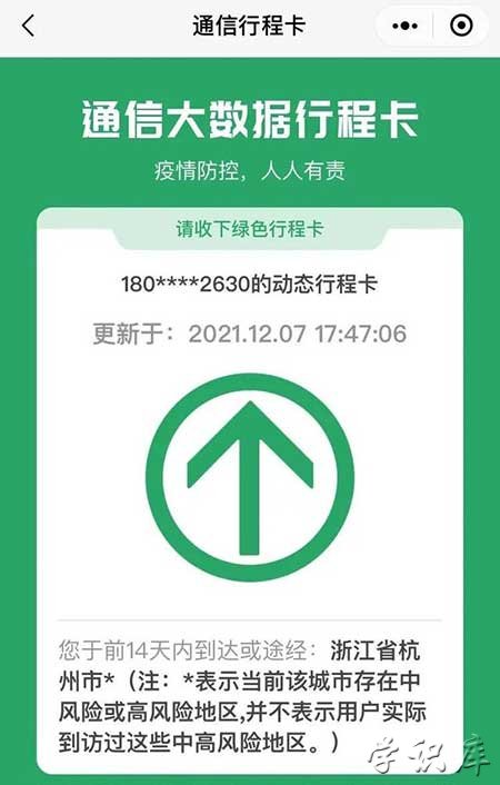 通信大数据行程卡,是由中国信通院联合中国电信、中国移动、中国联通三家基础电信企业利用手机“信令数据”,通过用户手机所处的基站位置获取,为全国16亿手机用户免费提供的查询服务,手机用户可通过服务,查询本人前14天到过的所有地市信息。