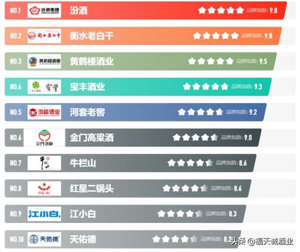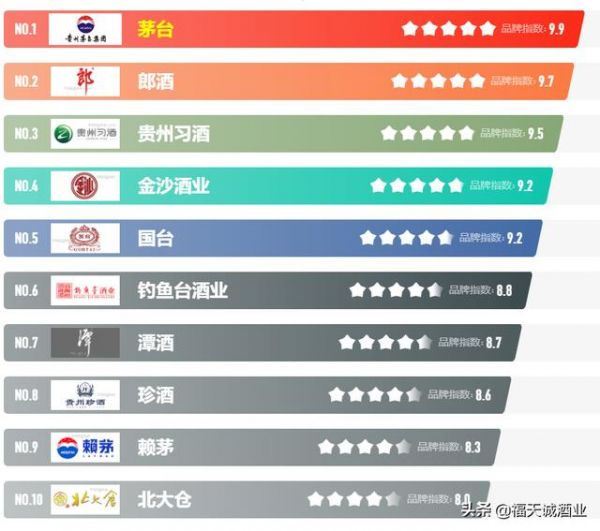 白酒因为品牌、原料和香型不同,价格也有从低到高,一般正常大多数价格50到200左右。好品牌白酒很多,各种香型都有排名,比如酱香型白酒:如图所示,分别是茅台、郎酒、贵州习酒、金沙酒、国台、钓鱼台、潭酒、珍酒、赖茅、北大仓。