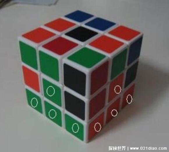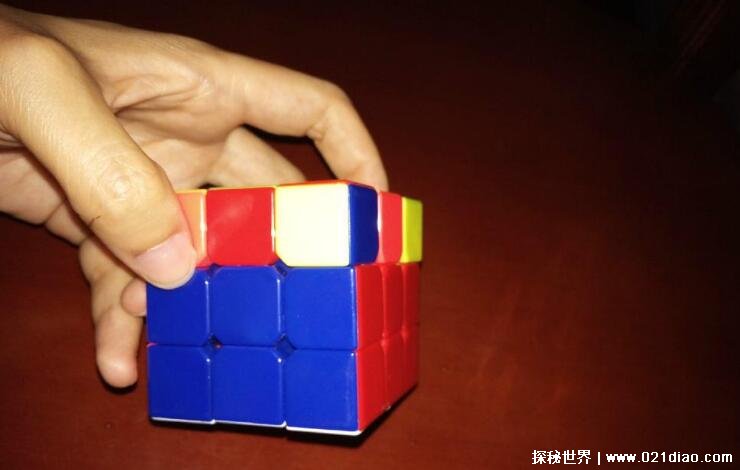 现在只差四个方块位置不对了,那么我们要先找到能够放在顶层右上角的方块,就是以自己的视角,找到在右边的顶层方块就可以了,也就是对位角方块,接下来使用公式: