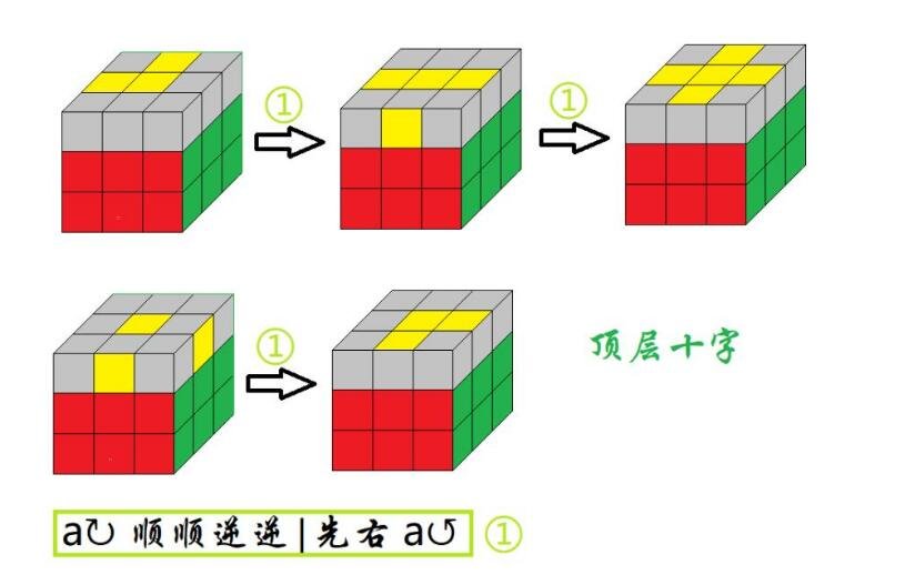 这一步需要做的是还原顶层的十字,随便扭到一面可以竖着连着三个颜色一样的方块,然后使用口诀: