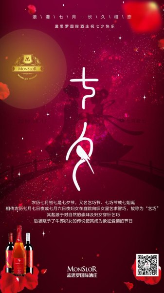七夕节起源于民间故事《牛郎织女》,相传牛郎织女一年一度的鹊桥相会就是在农历7月7日,又因为织女有一双能织云霞的巧手,民间的少女们希望能到织女的灵气,所以在七夕节那天“乞巧”,直到今日,七夕仍是一个富有浪漫色彩传统节日。但不少习俗活动已弱化或消失,惟有象征忠贞爱情的牛郎织女的传说,一直流传民间。在这个表达爱意的节日,免不了俗的有人送玫瑰花、巧克力,但是年年都是玫瑰花会不会显得很没创意呢?不管是已婚的、未婚的七夕都是不容错过的表白机会,火红热烈的玫瑰以及红酒,加上浪漫的烛光晚餐还愁虏获不了女神的芳心吗?红酒不仅仅是红酒,是品位、是健康、是美丽······