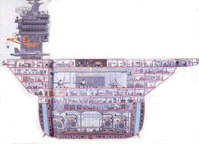 防护方面:所谓防护其实就是指遭受打击时的抗打击和抗沉能力。但是油轮根本不需要防护,有了防护反而是个累赘,因为他们只是商业船只。或许油轮可以用巨大的油舱带来的浮力保证其在海上漂浮,但是这与航空母舰专门进行防护设计有很大的区别。航空母舰的防护能力是最基本的要求,比如下图的“尼米兹”级核动力航空母舰,10道纵向水密舱壁和23道横向水密舱壁,全舰形成2000多个水密隔舱。而且全舰重点区域全部敷设装甲以提高抗打击能力,舰底设置防雷隔舱,可抵御战斗部500公斤级鱼雷打击。