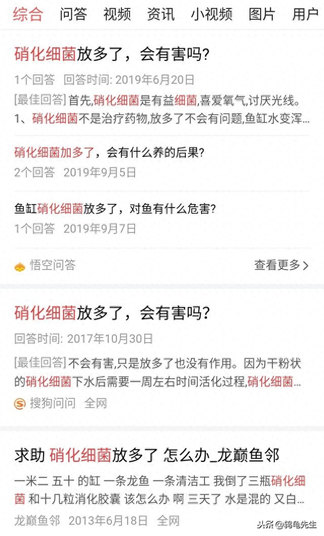 比如我们打开今日头条APP,以“硝化细菌加多了”为关键词搜索,可以查到至少2007年就有人问这个问题,一直持续到现在。就在昨天,悟空小秘书还给鸫龟先生推送了该问题,不得不说,这真是一个经久不衰的问题。难道回答了这么多年,就没有一个令人信服的答案吗?带着这个疑问,鸫龟先生翻阅了历年来的回答,发现“历史总是惊人的相似”。