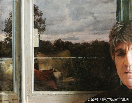 ▲图为徐芒耀2007年创作的油画作品《窗前的查尔斯》 ,把窗外外景和室内沙发在窗户玻璃上是的投影都逼真地画了出来。