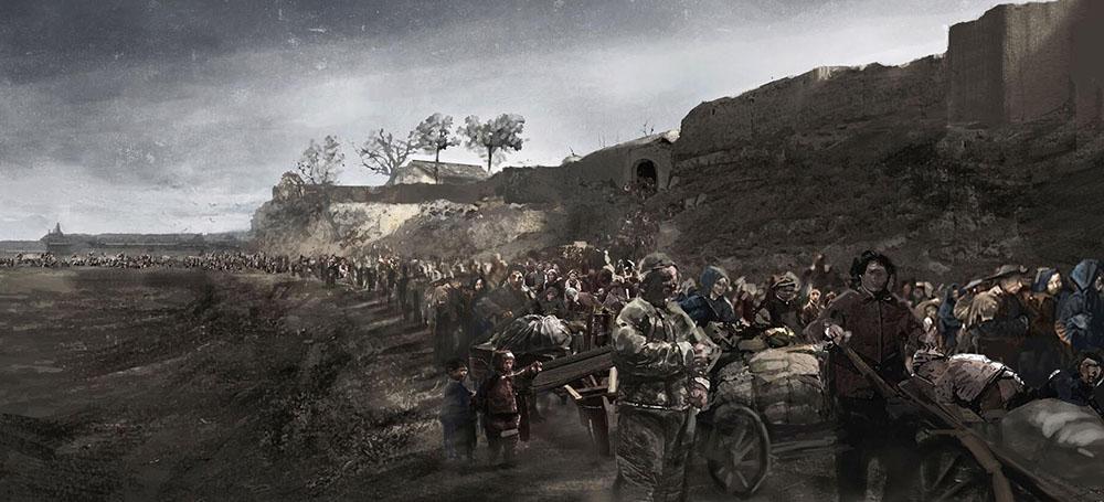 一场灾难下来妻离子散哭泣的人们,一面要忍受饥荒带来的痛苦,一面还要面临侵略者的摧残。在这样的社会现实下,人间的温情早已被摧枯拉朽般蹂躏。