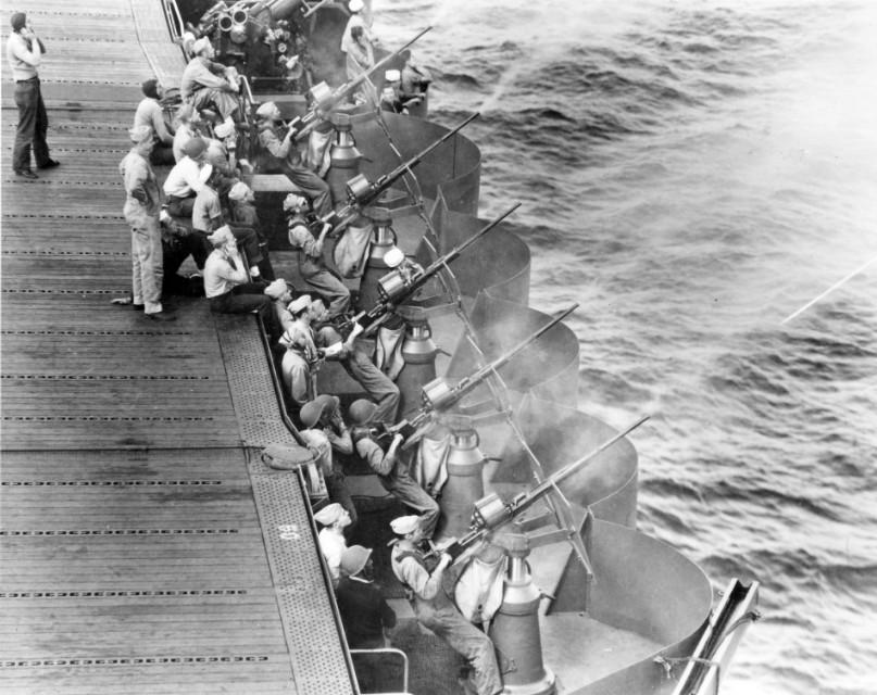 “企业号”舰舷的防空炮群,使用的是瑞典40毫米博福斯高炮和瑞士20毫米厄利孔高炮,图片里是20毫米炮,密集的阻拦“火墙”也会有漏网之鱼,日本“神风自杀机”在机翼下捆绑两枚250kg航弹,再加上机上的燃油…破坏力非常大。