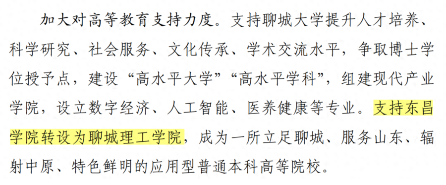 东昌学院(现址)2021年4月16日,聊城市人民政府办公室印发《聊城市国民经济和社会发展第十四个五年规划和二〇三五远景目标纲要的通知》(聊政发〔2021〕4号),已提出支持聊城大学东昌学院转设为聊城理工学院。