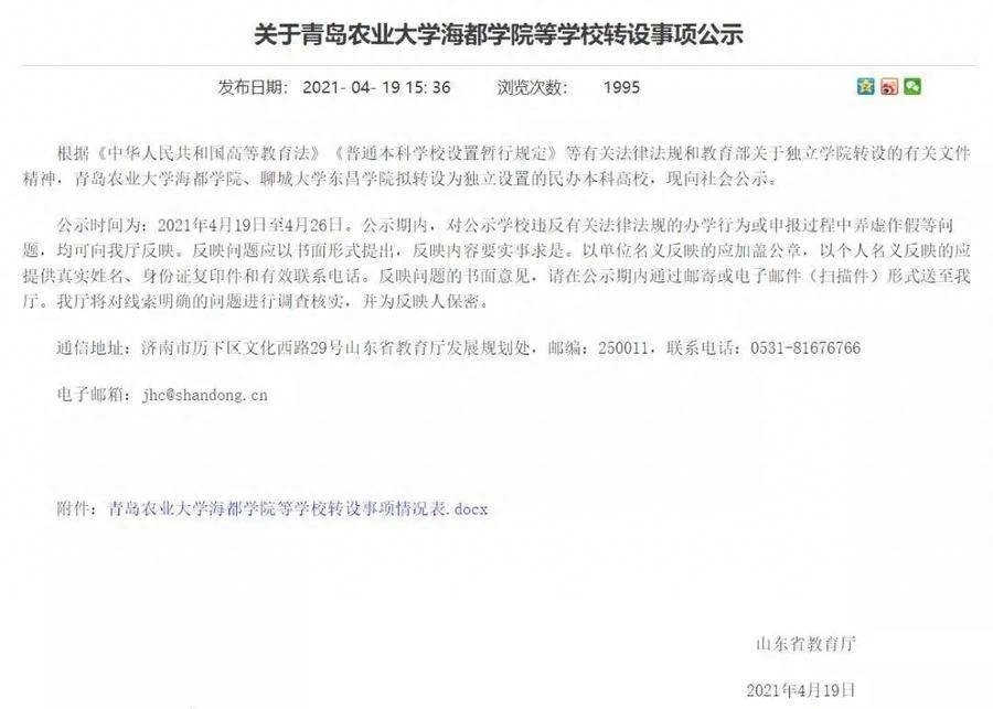 但到了2021年4月19日,山东省教育厅发布的《关于青岛农业大学海都学院等学校转设事项公示》中,聊城大学东昌学院转设后拟用校名为“东昌学院”,投资人也变更为聊城市财信投资有限公司。