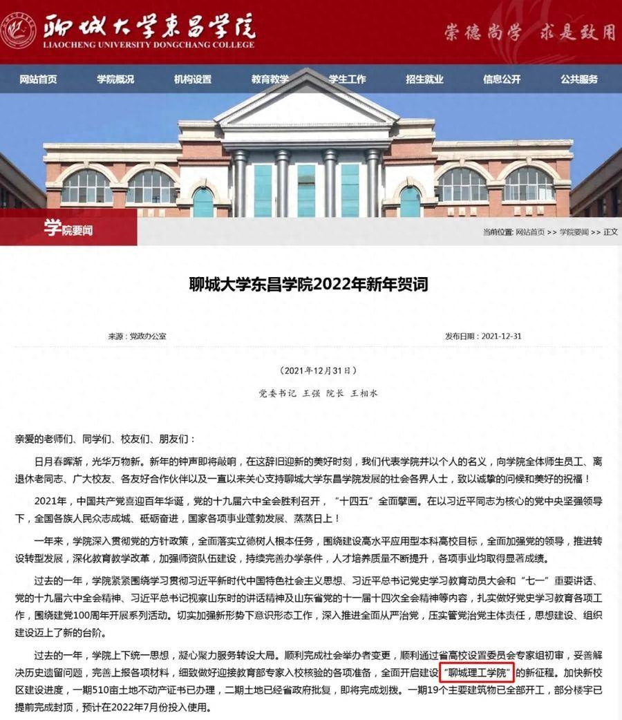 2021年12月31日,聊城大学东昌学院党委书记王强、院长王相水发表《聊城大学东昌学院2022年新年贺词》,其中提到: