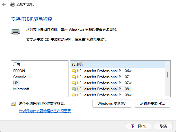 之前辛辛苦苦安装的打印机驱动程序 就可以看到了,选择需要的打印机型号 如P1108