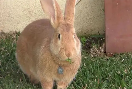 13.忌廉兔,体重3.8-5千克,毛长得很浓密,除了肚子的毛是奶白色外,身体其它部分都长有很漂亮的橙银色毛发,口鼻部分会较深色,但长大后会变浅,而眼睛则是咖啡色的。