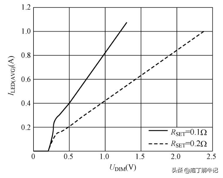 模拟调光时, 输出平均电流ILED(AVG)与模拟调光信号UDIM的特性曲线示例如图2所示, 图中的实线和虚线分别对应于电流检测电阻RSET=0.1Ω(最小値)、0.2Ω时的ILED(AVG)-UDIM曲线, 由图可见,当UDIM>>0.3V时,ILED(AVG)随UDIM的升高而线性地增大, 当DIM端悬空、L=47µH、ILED(AVG) = 1A, 驱动1只正向压降为3.2V的白光LED时,开关频率为300kHz(典型值),最高开关频率可达1MHz左右。