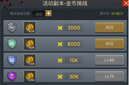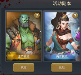 活动副本:20级开启的活动副本。通过金币挑战,勇者挑战可获得金币、强化药、进阶药和英雄碎片(战力越高挑战得到的金币越高)