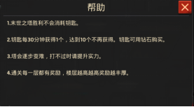 末世之塔: 24级开启末世之塔。可通过推塔获得高额金币和高级装备等(层数越高获得金币越高,高级装备的主要来源