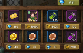 市场: 可通过金币钻石购买进阶药、强化药等等(还有很多好的道具)每三个小时增加一次免费刷新次数,也可以使用砖石刷新