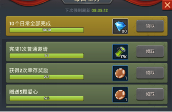 日常任务:通过17级解锁每日任务,完成后可获得(金币、钻石、转盘币、竞技场门票)。