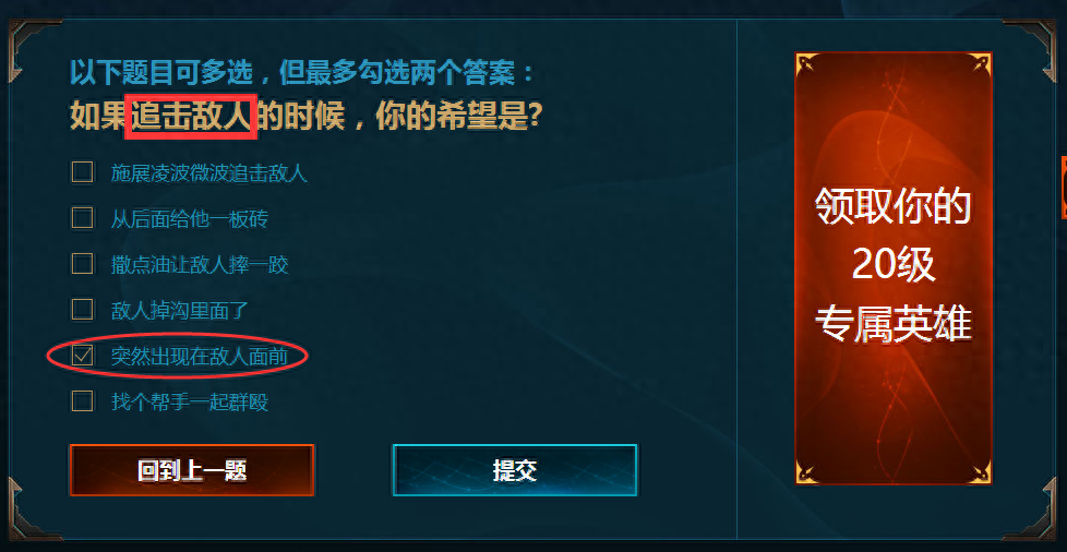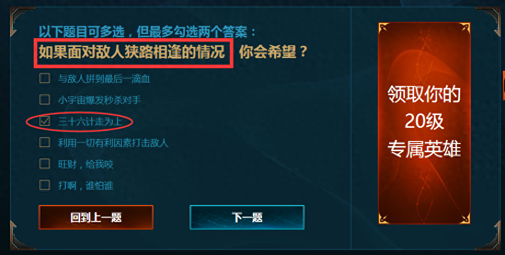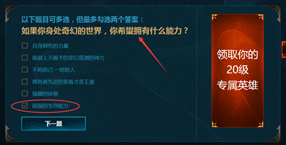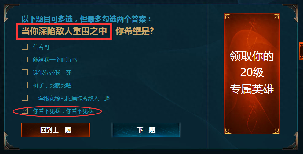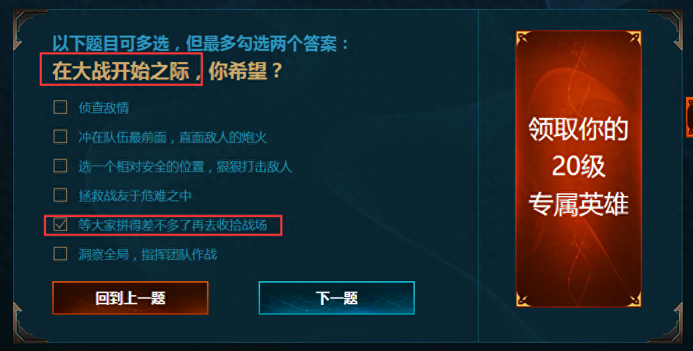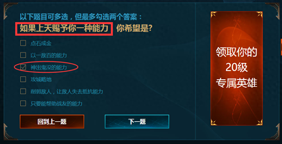 整个测试就是勾选一些选项,最后系统告诉你你的本命英雄是哪个,之后送给你这些英雄。小编根据自己的喜好,做了一遍这个测试,现公布一下结果: