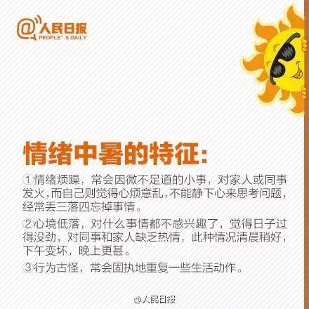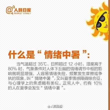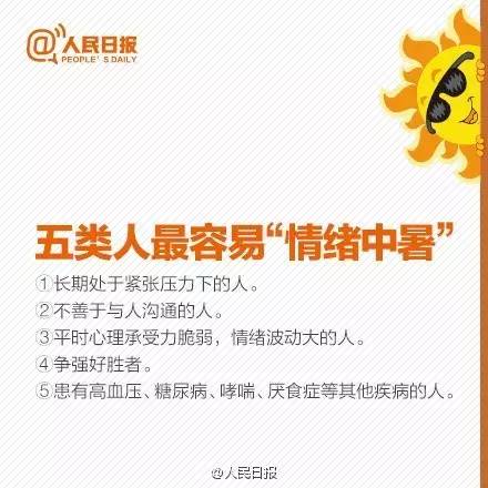高温天气下,你是否经常莫名发火,很容易跟别人起争执?小心!约有10%的人在夏季会“情绪中暑”,严重时,可导致各种事故的发生。如何防治“情绪中暑”,看下图↓看看身边有木有中枪的小伙伴?