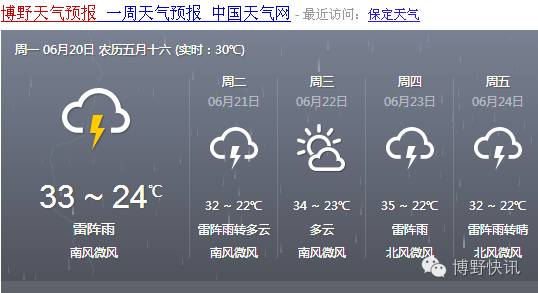 据中国天气网预报 : 预计未来几天,博野气温都会在30℃以上,周四将达35℃以上,而且高温伴随着雷阵雨,这不就是桑拿天吗?
