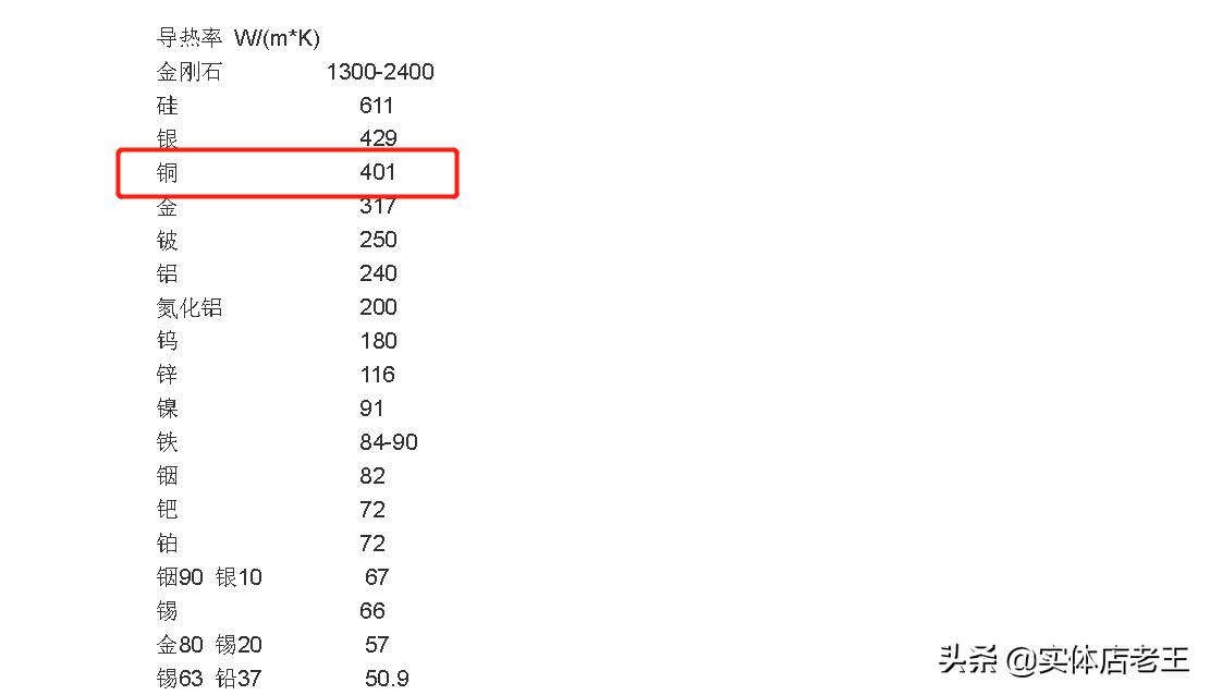 既然提到了石墨烯取暖器,那咱们就只关注它的“导热性能”,目前市场上公认的导热性能最好的材料就是银,但银太贵了,大多采用铜制的导热部件。铜的导热率是401W/mK(如上图),而石墨烯的导热率是5300W/mK,这相差了10倍不止。如果取暖器采用的导热金属是普通材料,导热性能相差100倍以上也是有可能的。也就是说“真正的石墨烯取暖器”的确是比传统取暖器好。