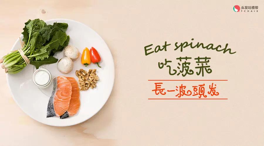 菠菜中的磷、铁可以通过补血来改善血液循环,促进毛囊生长,叶酸不仅能使头发更加光泽,告别干枯,而且能防止白发,β胡萝卜素、B族维生素群是人体每天必需补充的营养,对弥补头发所需营养和增强抵抗力都大有裨益!