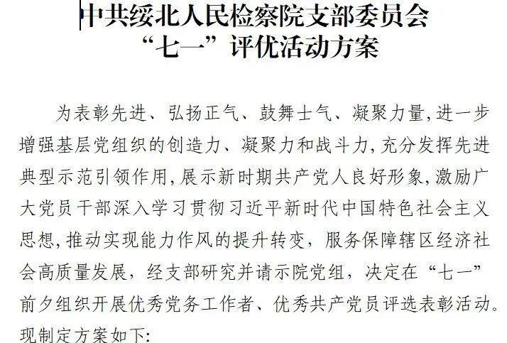 为表彰先进、弘扬正气、鼓舞士气、凝聚力量,进一步增强基层党组织的创造力、凝聚力和战斗力,充分发挥先进典型示范引领作用,展示新时期共产党人良好形象,出台了《中共绥北人民检察院支部委员会“七一”评优活动方案》,共评选出2名优秀党务工作者和10名优秀共产党员,将优秀标准具体化、优秀形象熟识化、典型带动扩大化,让广大党员干部学有榜样、做有标杆,在全院范围内形成“群众评党员、群众看党员、党员学标杆”的浓厚氛围。