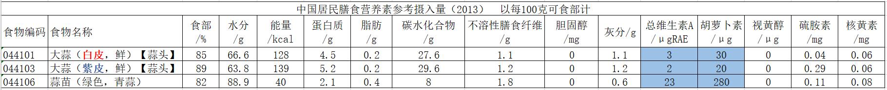 此外,发芽大蒜的营养物质也会跟随发生一些改变,下面以大蒜头和大蒜苗为例进行营养物质的对比。可以看到,蒜苗的维生素C含量大幅度提高,为蒜头的5倍;总维生素A是蒜头的8倍多,胡萝卜素是蒜头的9倍多;能量值也大幅度下降,不到蒜头的三分之一;钙磷钾镁锌硒等矿物质含量有不同的下降。