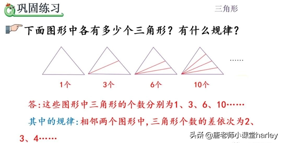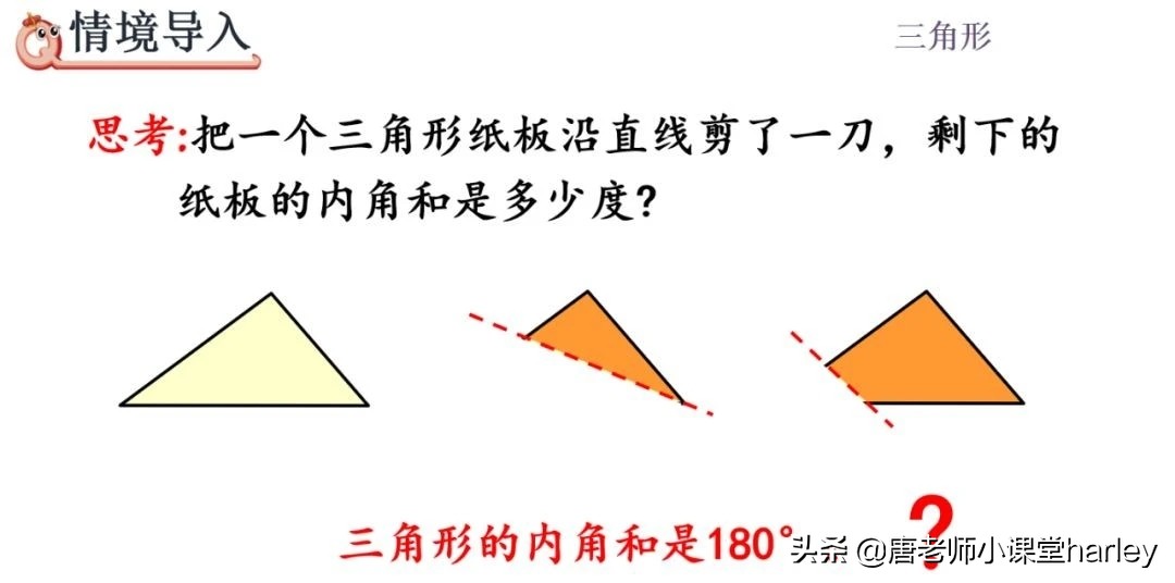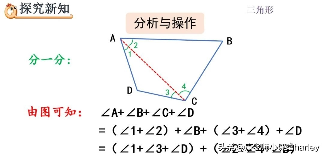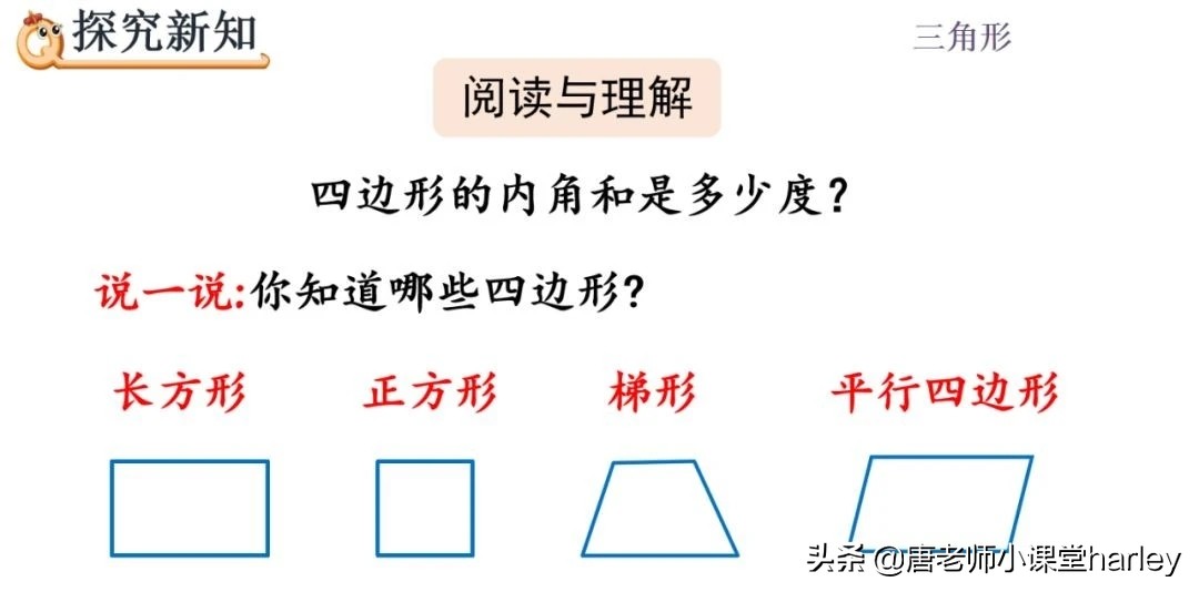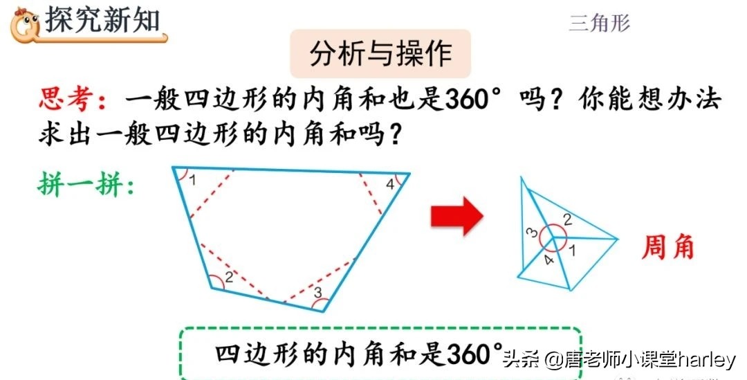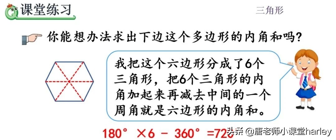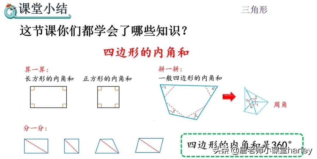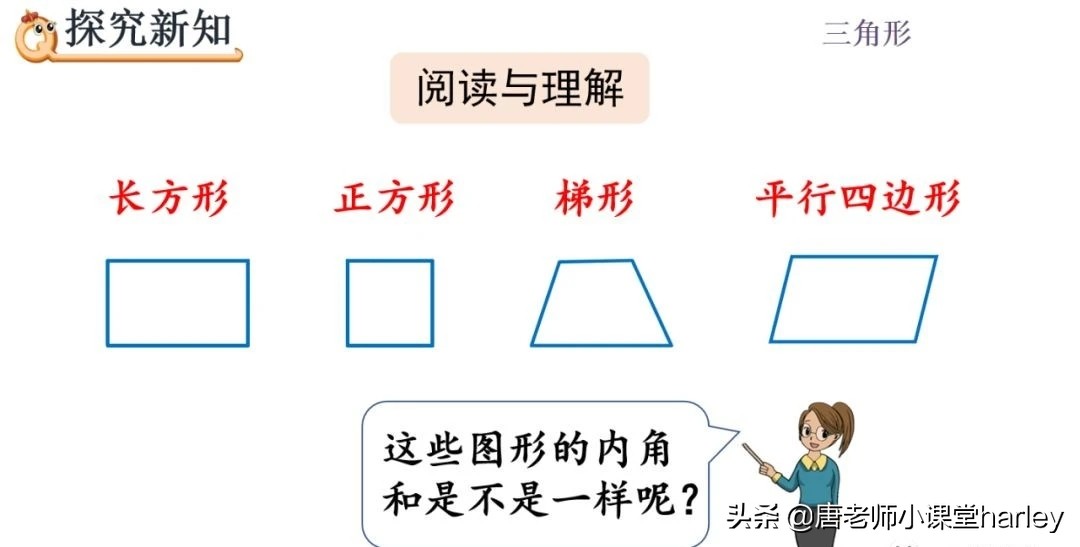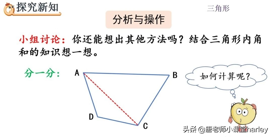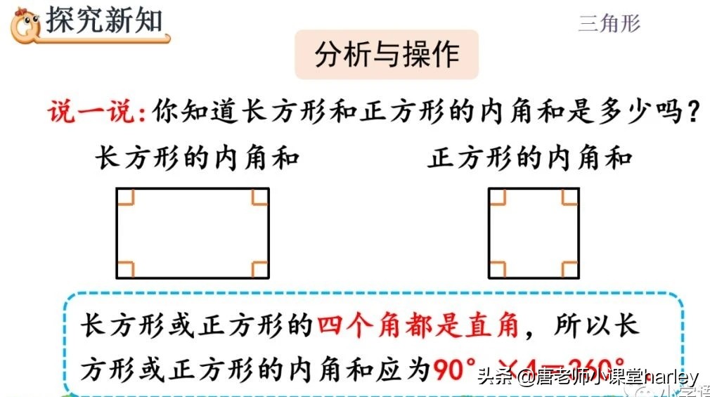 最终,多边形的内角和将以三角形,我们熟知的长方形,正方形为基础来进行探究,最终落脚点以三角形的内角和为基准,进行多边形的切割,看最终能有多少个三角形,就可以计算出多边形的内角和。这里将通过类比联想,转化推理等方法,让同学们在探究的过程当中自行去发现多边形计算的规律。