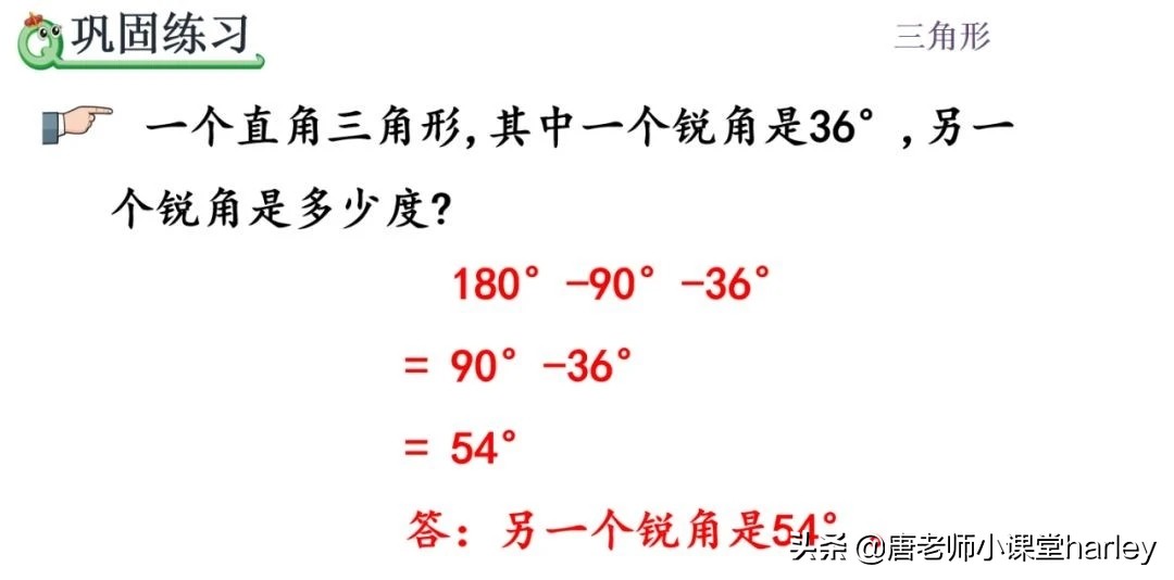 (5)一个直角三角形,有一个锐角是35°,另一个锐角是()。