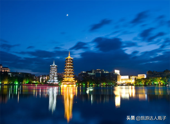 两江两湖景点是由榕湖、杉湖、桂湖、木龙湖、漓江、桃花江组成的一条与威尼斯水城相媲美的环城水系,一定要晚上去!桂林标识建筑——日月双塔