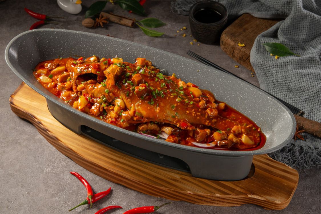 在徽菜中,人气最高的要属臭鳜鱼了。整条鱼搭配葱姜蒜、笋、肉、辣椒等配料先煎后烧,加入的作料不但不会喧宾夺主,反而吊出了鳜鱼的鲜。用筷子夹上一口鱼肉送入口中,细细地嚼起来多汁弹牙,口中满是鳜鱼特有的鲜甜,而这本该叫“腌鲜鳜鱼”的安徽美味,却由于有一种发酵过、似臭非臭的气味,让人一闻就令人皱眉毛,其实这“臭”只不过是一种“噱头”罢了,最终品味到的还是鳜鱼的鲜。
