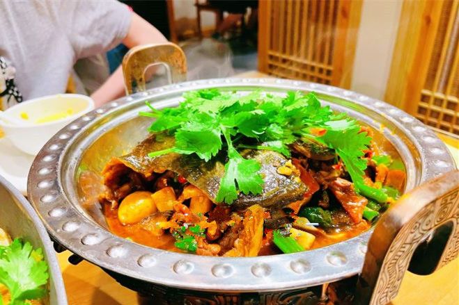 徽商沿徽杭古道南下经商,随着两地的频繁交往,易存放的火腿便被徽商们带回安徽,火腿自然而然也成了徽菜中的常用食材,其中火腿炖甲鱼就是徽菜的传统菜肴。当地的野生甲鱼滋味鲜美,搭配上醇厚的火腿,经过文火慢炖两者相互融合,香气扑鼻,满足味蕾的同时还有一定的滋补作用。