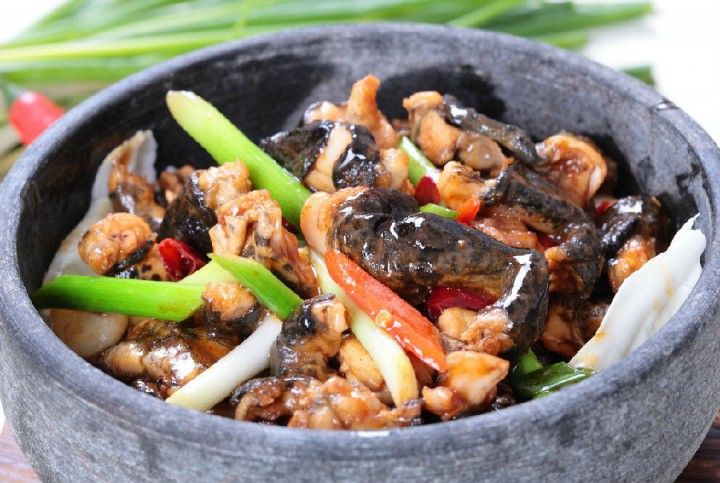 石鸡是一种栖息在山涧石缝中的一种蛙类,也是安徽黄山的特产,黄山石鸡腹部乳白、背黑有条纹,肉质鲜嫩细腻,富含蛋白质,在烹饪中搭配木耳、火腿、鸡汤等食材,放入蒸笼中蒸熟,即可享受它的鲜醇味道与细滑的肉质,称得上是徽菜中的一绝。