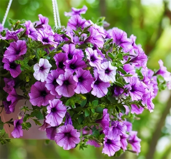 矮牵牛想必大家都不陌生,它是一种开花性能非常强的,可以用吊盆去养的一种开花植物,花色非常的多,而且它是一种耐高温的开花植物,所以到了夏天你养上几盆矮牵牛,把它种在吊盆里,放到太阳光底下去,只要光照足,不缺少水分,再去给他补充磷钾肥,它就能够不断长不断地往外冒花苞,养好了全年都能够开花。