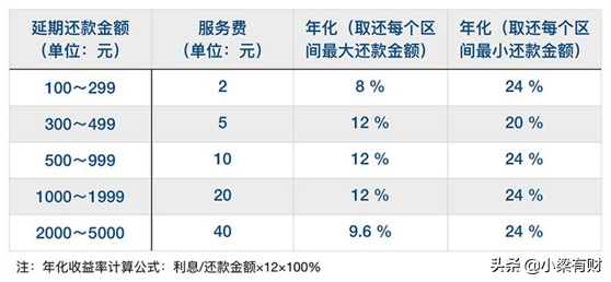 可延期还款的金额最低100元,最高5000元。根据还款金额不同,收费从 2 到 40 元不等。比如你需要延期还款1000元,则需要交手续费20元,获得宽限一个月的机会。看起来不多,算一下实际年化收益率20*12/1000=24%。可是一点都不低。