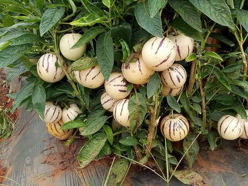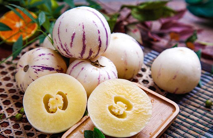 果实:浆果形状和颜色多样化,桃形、椭圆形或圆球形,成熟果实多为浅黄色或奶黄色,表面有紫色或绿色条斑。